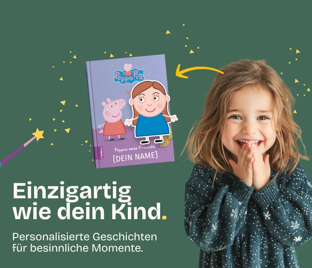 Freudiges Mädchen mit personalisiertem Buch Peppa Pig und [Dein Name]. Bücher einzigartig wie dein Kind. Personalisierte Geschichten für besinnliche Momente.
